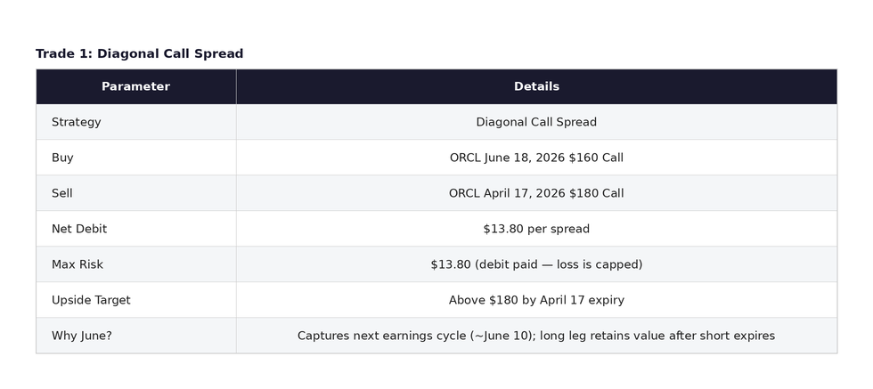 The diagonal spread structure buys time and sells the near-term move. By purchasing the longer-dated June $160 call and selling the shorter-dated April $180 call, the trader finances a portion of the long option’s cost. If ORCL rallies to or above $180 by the April 17 expiry, the short call expires in-the-money and the position benefits from the gains in the long June call. If the stock consolidates through April, the short call decays in the trader’s favor and the long June call retains much of its value heading into the next earnings cycle.
