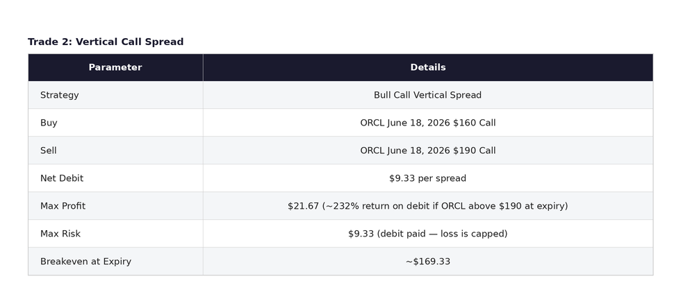 The vertical spread offers a lower-cost, defined-risk approach for traders who believe ORCL will trade between $170 and $190 by mid-June. The maximum gain of $21.67 represents a potential return of approximately 232% on the $9.33 debit if ORCL trades above $190 at expiration. For more conservative traders, the vertical spread may be the preferred vehicle given its lower capital requirement and simpler management profile. The diagonal offers more flexibility across two expiration cycles but requires closer attention as April 17 approaches.